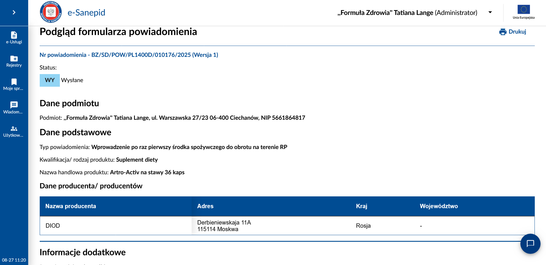 Dystrybutor: Formuła Zdrowia Warszawska 27 06-400 Ciechanów.