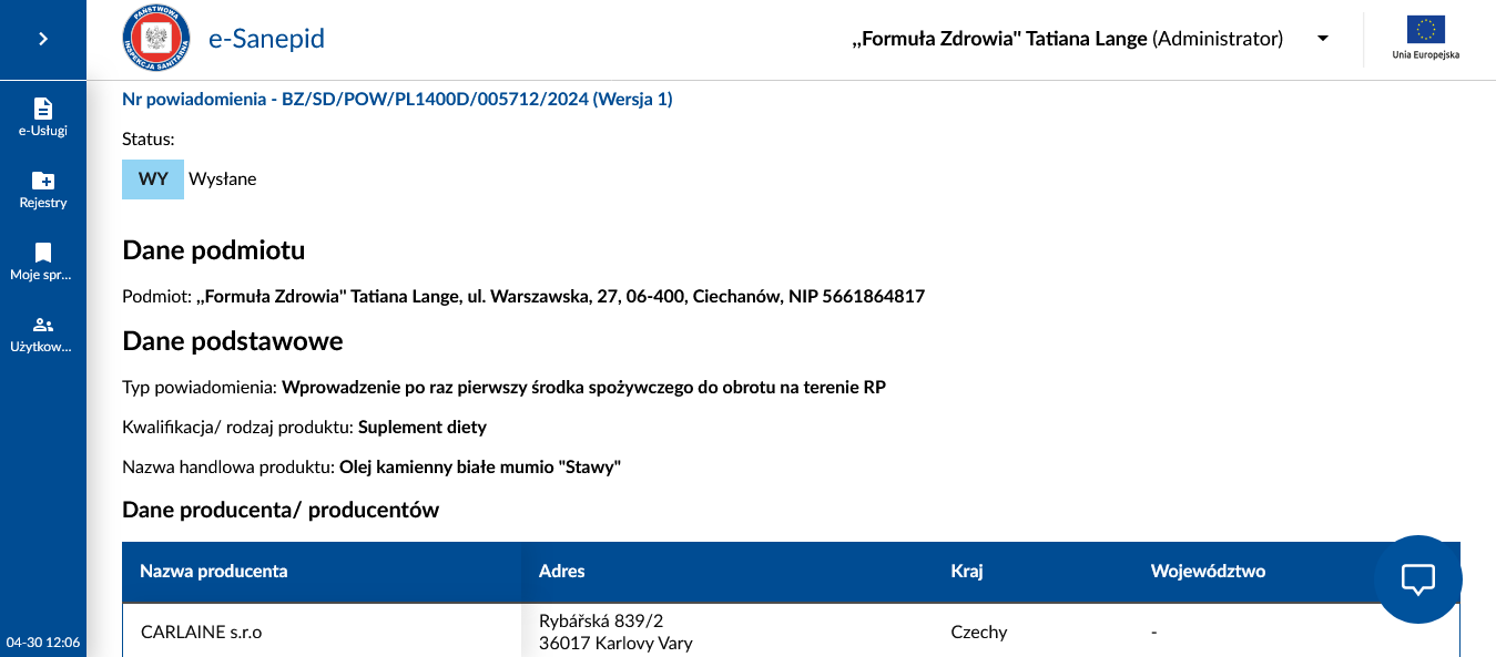 Dystrybutor: ,,Formuła Zdrowia’’ Warszawska 27, 06-400 Ciechanów